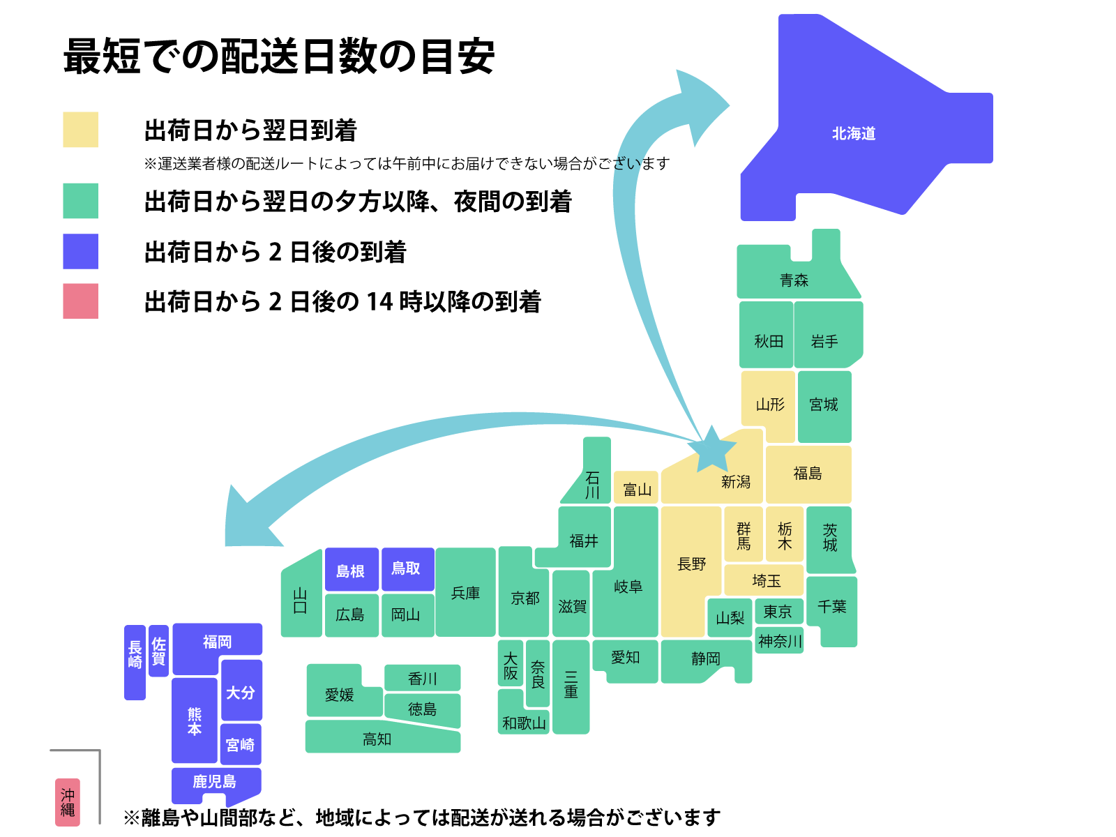 配送地域により、お届け可能日が異なりますので詳細は以下地図にてご確認下さい。 なお、誠に申し訳ございませんが即日スピード発送は平日のみのご注文対応とさせていただきます。