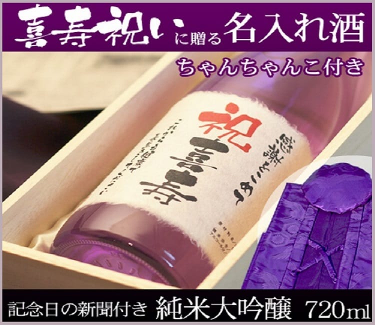 また、長寿祝いのギフトを取り扱う専門店では、瓶や包装を紫色にまとめてくれる、記念日新聞を添えてくれるなど喜寿祝いにふさわしいサービスがあります。こういったオプションやサービスが充実した名入れ酒を選び、お祝いムードをより高めましょう。