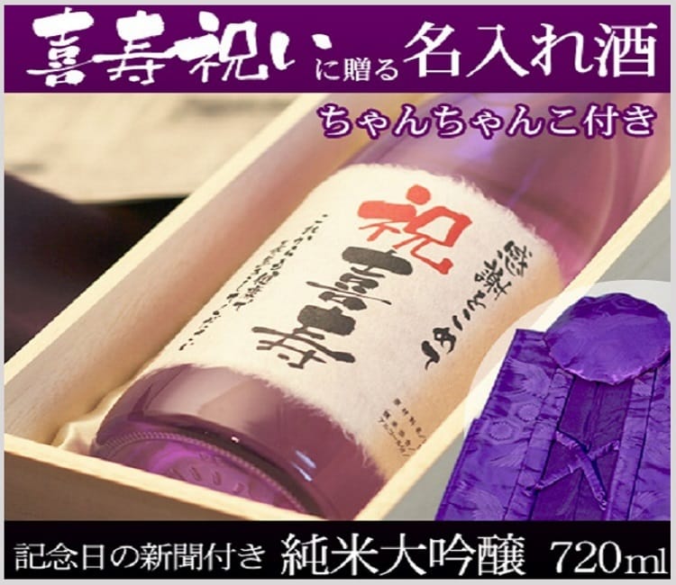 お酒好きの方には、「名入れ酒」もおすすめです。名入れ酒とは喜寿の方の名前をラベルに入れたお酒のことで、自分だけの特別なお酒になるので、頂いた方は感激されると思います。