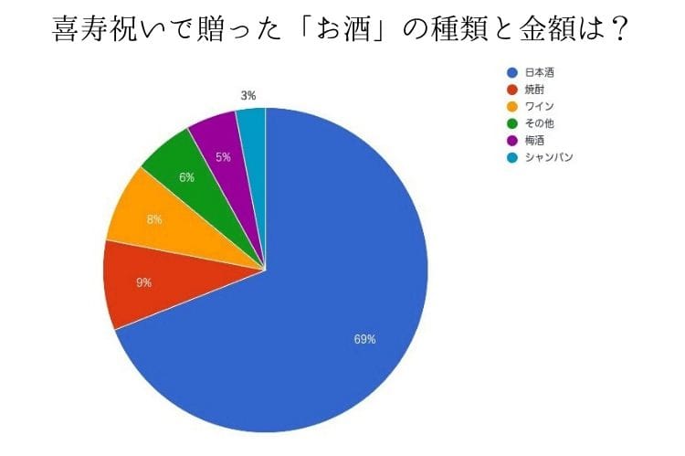 アンケート調査の結果、喜寿祝いでもっとも多くの方から贈り物に選ばれていたのは「日本酒」ということが分かりました。実に7割近くの方がプレゼントとして日本酒を選んでいたことから、やはりお酒での定番の贈り物だといえるでしょう。続いて、「焼酎」「ワイン」の順番で並んでいますが、ほぼ同数となっています。