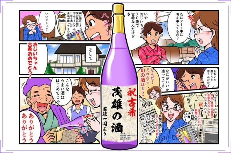 お祝いの定番として喜ばれるのは、やはりお酒です。お酒は様々なお祝いのシーンで贈られることが多いですが、古希祝いの特別感を出したいのならお酒のラベルに一工夫するのがおすすめです。