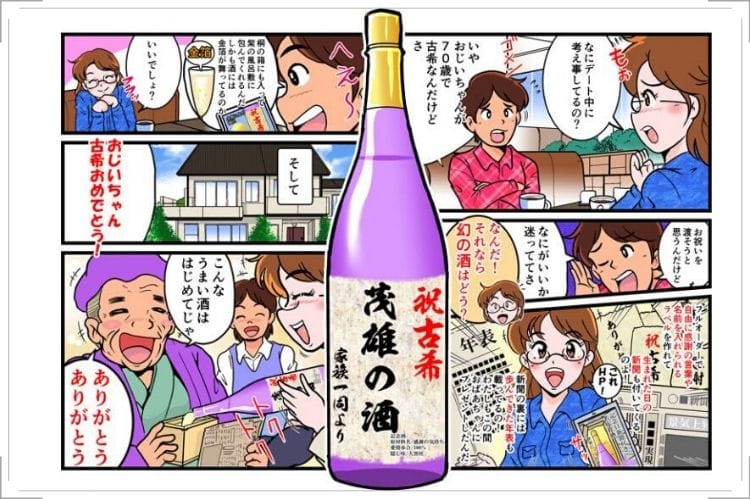 好きなお酒、そして好きな字体でお名前を記載してくれるので、世界でひとつだけのお酒となり、古稀を迎える方だけの特別なお酒をプレゼントできるのもなかなか粋ですね。