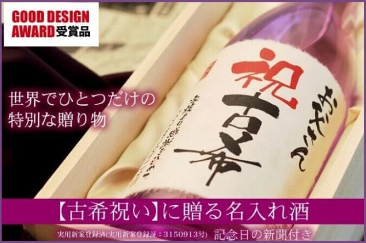 お酒もお祝いの席では定番の贈り物。中でもフルオーダーで世界に一つだけのお酒になる名入れ酒の贈り物が古希祝いには人気があります。